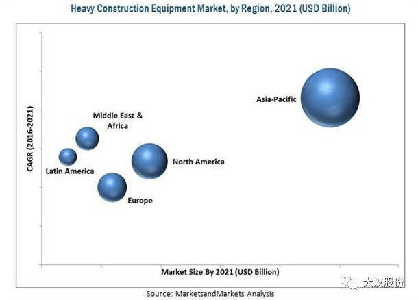 據(jù)MarketsandMarkets預(yù)測(cè),重型建筑設(shè)備市場(chǎng)規(guī)模將從2016年的1291.1億美元增長(zhǎng)到2021年的1806.6億美元,估計(jì)復(fù)合年增長(zhǎng)率為7.0%。預(yù)計(jì)重型建筑設(shè)備市場(chǎng)將由于城市化程度提高、基礎(chǔ)設(shè)施和工業(yè)部門的大規(guī)模投資以及新興經(jīng)濟(jì)體的建設(shè)活動(dòng)增加而高速增長(zhǎng)。
